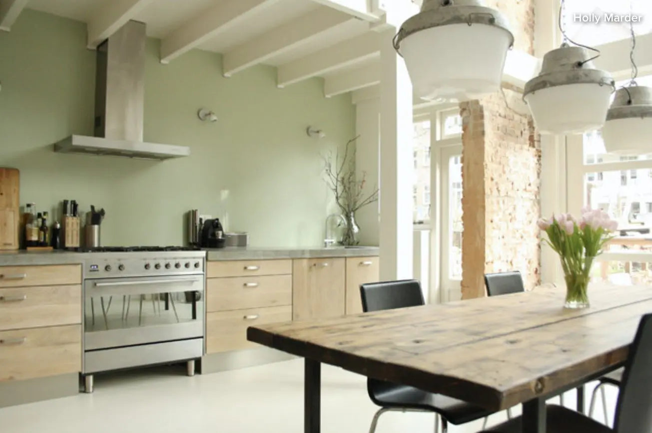 Cooking Apple Green is a Farrow & Ball classic which always feels charmingly familiar and, like all greens, creates the feeling of health and vigour. It has a rich, old fashioned look in darker situations, but often feels much fresher and brighter in well lit rooms and when contrasted with a bright white.